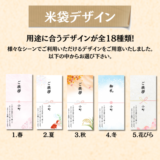 TOP品種から選ぶ ギフト商品 様々な場面で活躍!デザインが選べる貰って嬉しいお米プチギフト 2合(300g) 価格: ¥530 (税込) [ポイント還元 5ポイント~] 販売期間: 1.お米の銘柄をお選びください。: 選択してください 1.あきたこまち 2.サキホコレ 3.ひとめぼれ 4.ミルキークイーン 5.きぬのはだ(餅米) 2.米袋のデザインをお選びください。: 選択してください 1.春 2.夏 3.秋 4.冬 5.花びら 6.青海波柄 7.新年 8.出産祝い 9.記念日 10.金 11.ポップ 12.おにぎり 13.睡蓮 14.蓮 15.御餞別 16.御餞別(桜) 17.御餞別(猫) 18.御餞別(おにぎり) 3.表書き(上に入れる文字)を入力してください。: 4.お名前(下に入れる文字)を入力してください。: 不要の場合は不要と入力 5.メッセージを入力してください。: 不要の場合は不要と入力 6.ご注文は5個以上からお願いいたします。: ※5個未満のご注文の場合はキャンセルとさせていただきます。 選択してください 了承しました 数量: 個 在庫 在庫切れ 返品についての詳細はこちら 商品情報 名称 精米 産地 秋田県産 品種 あきたこまち、サキホコレ、ひとめぼれ、ミルキークイーン、きぬのはだ 産年 令和7年産 内容量 300g 精米年月旬 ご注文後精米致します