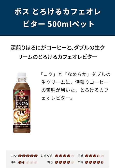 TOP商品一覧 サントリー ボス とろけるカフェオレビター500ml 24本入 価格: ¥3,360 (税込) [ポイント還元 33ポイント~] 販売期間: 数量: 箱 在庫 在庫あり 返品についての詳細はこちら 商品情報 シリーズ名 サントリーボス ブランド名 サントリー 総入数 24本